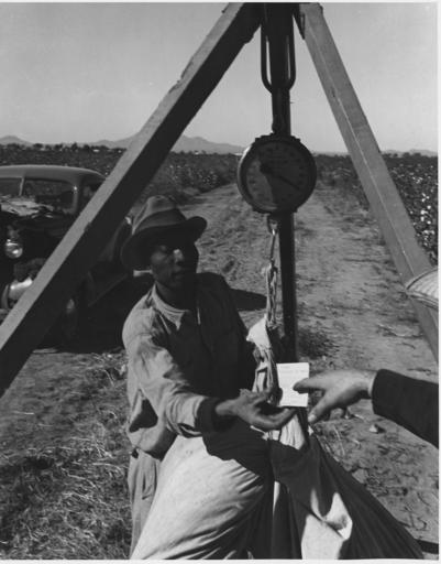 | Keywords: Cortaro Farms, Pinal County, Arizona. Picker on Cortaro Farms receives his ticket, punched by the we . . . - NARA - 522504.jpg Scope and content Full caption reads as follows Cortaro Farms Pinal County Arizona Picker on Cortaro Farms receives his ticket punched by the weighmaster according to the number of pounds of cotton he has just picked General notes 522504 Local identifier 83-G-44335 Department of Agriculture Bureau of Agricultural Economics Division of Economic Information ca 1922 - ca 1953 NARA-Author Lange Dorothea 1895-1965 Photographer 1372774 <br /> Still Picture Records Section Special Media Archives Services Division NWCS-S National Archives at College Park 8601 Adelphi Road College Park MD 20740-6001 11/1940 Record group Record Group 83 Records of the Bureau of Agricultural Economics 1876 - 1959 Record group ARC 412 Photographic Prints Documenting Programs and Activities of the Bureau of Agricultural Economics and Predecessor Agencies compiled ca 1922 - ca 1947 documenting the period ca 1911 - ca 1947 Series ARC 521048 File unit File unit ARC Variant control numbers NAIL Control Number NWDNS-83-G-44335 Other versions <gallery> File Cortaro_Farms _Pinal_County _Arizona _Picker_on_Cortaro_Farms_receives_his_ticket _punched_by_the_we_ _ _ _-_NARA_-_522504 tif tif File Cortaro_Farms _Pinal_County _Arizona _Picker_on_Cortaro_Farms_receives_his_ticket _punched_by_the_we_ _ _ _-_NARA_-_522504 jpg jpg </gallery> NARA-cooperation PD-USGov Dorothea Lange Cortaro Farms Agricultural workers Weighing scales in the United States Cotton industry in Arizona Cotton sacks Men at work in the United States Cotton fields 1940 in Arizona November 1940 in the United States |