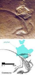 | Keywords: Cosesaurus-insitu.png Cosesaurus aviceps the sole specimen of this genus Although lizard-like in appearance this Middle Triassic fenestrasaur/lizard had certain traits that place it on the lineage of Sharovipteryx Longisquama and pterosaurs Among these traits are an elongated narial opening an antorbital fenestra a very large orbit a spike-like quadratojugal a strap-like scapula a stem-like coracoid an enlarged sternum displaced anteriorly to align with transverse clavicles a pteroid an elongated anterior process of the ilium a sacrum consisting of four vertebrae a prepubis a simple hinge ankle joint without fusion of the astragalus and calcaneum a calcaneum without a heel and an elongated pedal digit 5 plus soft tissue membranes arising from the trailing edges of the limbs and the dorsal margin of the spine and skull No digits were vestigial but manual digit V was reduced Study specimen accessed through the Museu de Geologia in Barcelona Spain David Peters 2011-06-09 Cc-zero Cosesaurus |