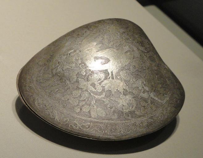 | Keywords: Cosmetic box in form of a clamshell, probably Chang'an, Shaanxi province, China, early to mid Tang dynasty, late 7th-early 8th century AD, cast and hammered silver - Freer Gallery of Art - DSC05613.JPG en Exhibit in the Freer Gallery of Art Washington DC USA This artwork is old enough so that it is in the public domain Photography was permitted in the museum without restriction 2013-02-12 15 58 42 own Daderot cc-zero Uploaded with UploadWizard Metalwork of China in the Freer Gallery of Art Metalwork of the Tang Dynasty |