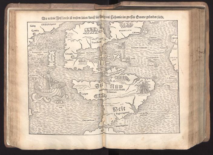 Keywords: Cosmographia (Sebastian Münster) p 123.jpg p_122 p_124 Old maps of the Americas Ships on maps