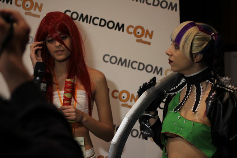 Keywords: Cosplay at Comicdom 2012 in Athens, Greece 18.JPG en A cosplayer identified as Sofia Lucifairy wearing a self-made costume representing the Tira character from Soulcalibur V grants an interview to journalists from the MTV television channel and also poses for other the photojournalists' cameras at Comicdom 2012 an annual cosplay competition held at Hellenic American Union in Kolonaki Athens Greece Photo donated to the public domain free of copyright restrictions Journalistic use For Journalistic use 2012-03-31 18 14 40 own Cogiati cc-zero consent public place Interviews with cosplayers at Comicdom 2012 Cosplay of Tira Soulcalibur Green clothing female Taken with Canon EOS 60D |