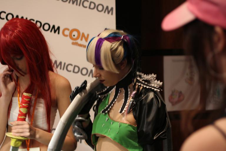 Keywords: Cosplay at Comicdom 2012 in Athens, Greece 21.JPG en A cosplayer wearing a self-made costume representing the Tira character from Soulcalibur V grants an interview to journalists from the MTV television channel and also poses for other the photojournalists' cameras at Comicdom 2012 an annual cosplay competition held at Hellenic American Union in Kolonaki Athens Greece Photo donated to the public domain free of copyright restrictions Journalistic use For Journalistic use 2012-03-31 18 14 47 own Cogiati cc-zero consent public place Canon EF 50mm f/2 5 Compact Macro Canon EOS 60D Cosplay of Tira Soulcalibur Uploaded with UploadWizard Green clothing female Cosplay at Comicdom 2012 Cosplay in Greece Taken with Canon EOS 60D |
