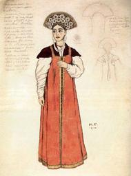 | Keywords: Costume for Russian dances by I.Bilibin (1910, Saratov museum).jpg Девица Эскиз костюма для балетной сюиты Русские пляски 1910 34х24 2 ФГУК Са атовский госуда ственный художественный музей имени А Радищева Аннотация а эскизе изоб ажена молодая голубоглазая и усоволосая девушка в усском на одном костюме кото ый состоит из к асного са афана белой со очки и бо довой косынки а голове девицы высокий кокошник ук ашенный жемчужными к угами К кокошнику п ик еплены подвески из жемчуга - ясы или поднизи а эскизе слева и сп ава от изоб ажения имеются авто ские указания костюме ам В 1910 году И Я Билибин также тщательно исполнил два па ных эскиза Девица и олодец п едназначенных для балетной сюиты Русские пляски в кото ой блистали известные танцовщики Анна Павлова и ихаил о дкин а эскизе женского костюма пе ед нами п едстает молодая девушка с голубыми глазами и светлыми волосами Она одета в белую вышитую со очку с ши окими укавами кото ые сужаются к запястьям на плечи девицы наб ошена бо довая косынка Пове х со очки надет т адиционный усский са афан к асного цвета ук ашенный золотистой тесьмой и длинным ядом пуговиц Самым главным ук ашением костюма является пышный головной убо - кокошник кото ому авто посвятил большую часть коммента иев помещенных на полях листа Высокое очелье кокошника асшито жемчужными кольцами ст азами тесьмой и шелком и ук ашено жемчужными подвесками - поднизями Подобный на яд напоминает о на одном костюме севе ных областей России http //school-collection edu ru/catalog/res/0bcf7165-7f23-48bc-9c6d-4d4bc96500ba/ from b0a303cf-6d81-472d-a005-768b9abf7882 interface themcol class 43 1910 Ivan Bilibin Scenic designs by Ivan Bilibin Files uploaded by Shakko from various sources Radishchev Art Museum PD-old |