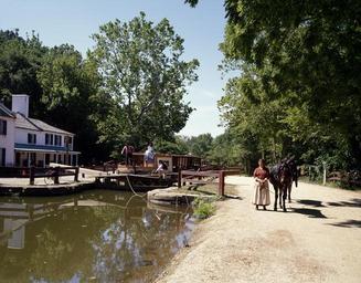 | Keywords: Costumed interpreter with a mule on the canal towpath at the Chesapeake and Ohio Canal Lock 20.tiff en Pic of Costumed Interpeter with boat at Lock 20 Great Falls Tavern on Chesapeake and Ohio Canal <br> Notes The LoC's original scan of the digital transparency is flipped backwards which has been fixed here <br> Also the posing in the photo is strange The man on the lock gate and the position of the mules indicate the boat is going upstream but the man at the tiller should be at the stern not the bow as seen here There is no need for the man to have his hand on the valve handle Once the wickets are open to fill the lock there is no need to touch the handle until the gates are almost all the way open Then one closes the wickets so the iron valve doesn't hit the canal masonry There is also a man on the stern blowing a horn which is strange since normally canallers blew the horn to warn of the boat approaching the lock; while in the lock the horn blowing serves no purpose Mules are not hitched up Hitch is lying on ground Boat is the old Canal Clipper boat scrapped since the time of this photo highsm 15394 1 transparency color ; 4 x 5 in or smaller Highsmith Carol M 1946- photographer accession number LC-DIG-highsm-15394 digital file from original LC-HS503-3785 color film transparency between 1980 and 2006 credit line Rights Advisory No known restrictions on publication PD-Highsmith Chesapeake Ohio Canal National Historical Park |