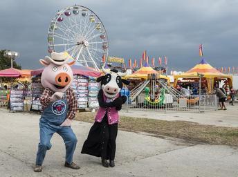 Keywords: costumed pig and cow characters carnival fair cartoon ferris wheel fun