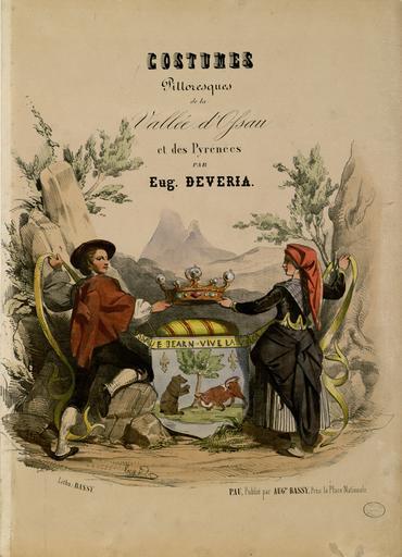 | Keywords: Costumes pittoresques de la vallée d'Ossau et des Pyrénées ^^091,Titre lithographié^^093, - Fonds Ancely - B315556101 A DEVERIA 002.jpg La page de titre et les 6 planches sont signées E Devéria et sont lithographiées en couleurs et réhaussées à l'aquarelle - Cartonnage d'éditeur papier vert sur lequel la page de titre est reproduite en noir Il existe plusieurs tirages de cet ouvrage qui comprennent au moins les six planches de costumes en hauteur numérotées de 1 à 6 et selon les cas deux ou trois planches en largeur non numérotées Le premier tirage intitulé Costumes pittoresques de la vallée d'Ossau et lithographié par E Vignancour est daté de 1844 ; le tirage dont il est question ici est ultérieur sans date On note plusieurs différences entre les différents tirages les deux dernières planches notamment se distinguent voir Labarère Bibliographie pyrénéiste 486 Dans ce tirage les titres sont en capitales romaines maigres La pl 6 intitulée Guide aux Eaux-Bonnes porte les mentions Chez A Bassy Pau et Lith de E Vignancour au contraire des autres planches qui portent la mention Edité et lith par A Bassy à Pau Ancely René 1876 - 1966 Possesseur fre public domain domaine public B315556101_A_DEVERIA_002 jpg image/jpeg 1 f de pl lithogr en coul ; 42 5 cm Bassy Auguste http //numerique bibliotheque toulouse fr/collect/general/index/assoc//ark /74899/B315556101_A_DEVERIA_002 dir/B315556101_A_DEVERIA_002 jpg Bibliothèque municipale de Toulouse A-DEVERIA 1 Creator Eugène Devéria http //catalogues toulouse fr/web2/tramp2 exe/do_keyword_search/log_in setting_key BMT1 servers 1home query p000363 vignette http //numerique bibliotheque toulouse fr/collect/general/index/assoc//ark /74899/B315556101_A_DEVERIA_002 dir/B315556101_A_DEVERIA_002_thumb jpeg by 1844 Costumes pittoresques de la vallée d'Ossau et des Pyrénées Titre lithographié B315556101_A_DEVERIA_002 colour print - lithography - print - colors - color lithograph Women in art Vallée d'Ossau History of clothing Skirts in art Petticoats Berets Mountains in art Trees in art Caps in art French national costumes Historical images of Eaux-Bonnes Historical images of Pyrénées-Atlantiques People of Pyrénées-Atlantiques Eugène Devéria Gaiters National costumes in art Rocks in art Men in art Couples in art Redingotes in art Bodices |