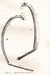 | Keywords: CoteChevalChauveau1980.jpg en Two types of ribs of horse Equus caballus the 5th true rib internal view and the 1st false rib external view fr Deux types de côtes du cheval Equus caballus la 5e sternale ou vraie côte Costae verae vue interne et la 1re asternale Costae spuriae vue externe <br /> 1 tête de la côte Caput costae <br /> 2 scissure de la côte <br /> 3 col de la côte Collum costae <br /> 4 tubercule tubérosité de la côte Tuberculum costae <br /> 5 facette articulaire de la côte <br /> 6 fossette rugueuse pour l'insersion du ligament interosseux transverso-costal <br /> 7 sillon costal gouttière de la face externe de la côte Sulcus costae <br /> 8 scissure vasculo-nerveuse du bord postérieur de la côte <br /> 9 cartilage costal cartilage de prolongement de la côte Cartilago costalis <br /> 10 renflement articulaire qui répond au sternum <br /> ” Chauveau Auguste Arloing Saturnin Traité d'anatomie comparée des animaux domestiques 1 064 p page 101 1890 Paris Lib J B Baillière et Fils domaine public décès des auteurs 1917 et 1911 Meyer C 2011-03-12 PD-old Horse bones Ribs skeleton |