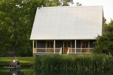 Keywords: cottage house cabin lake waterfront tranquil residence residential roof porch railing grass water trees forest estate real estate rural property mortgage rustic exterior