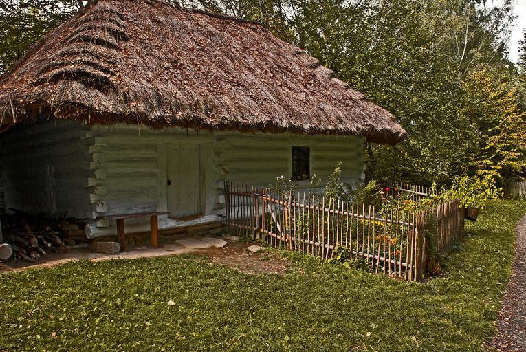 Keywords: cottage old wooden house the roof of the straw the door window thatched roof wooden cottage village wooden balls hurdle mood monument shadow eaves bench basket wicker wooden architecture poland the bars