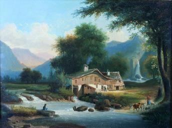 | Keywords: Cottage and Stream.jpg Artist Probably 19th Century oil canvas approx 15-1/2 x 21 inches A rustic cottage perhaps a sawmill by a stream; with an angler a herder with a cow and goats a distant waterfall and mountains Private Collection Public domain May be reproduced without permission PD-Art PD-Art Landscape paintings Cottages in art Paintings of cattle |