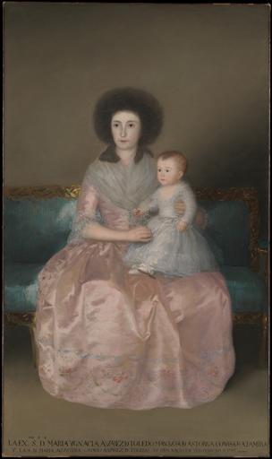 | Keywords: Countess of Altamira and her Daughter by Goya.jpg Portrait of Countess of Altamira and Her Daughter Maria Agustina Retrato de la condesa de Altamira María Ignacia Alvarez de Toledo con su hija c 1787-1788 Oil on canvas cm 195 115 Institution Metropolitan Museum of Art Metropolitan Museum of Art other versions PD-Art-old-100 DEFAULTSORT 1787 1788; Countess of Altamira Daughter Female portraits by Francisco de Goya Children portraits by Francisco de Goya Family portraits by Francisco de Goya 18th-century portrait paintings in the Metropolitan Museum of Art María Ignacia Álvarez de Toledo y Gonzaga House of Osorio 1780s dresses 1780s portrait paintings from Spain 1787 births 18th-century family portraits 18th-century oil portraits of sitting girls at full length 18th-century oil portraits of sitting women at full length 18th-century women of Spain Couches in portrait paintings Females with pink dresses in art Fichu Lehman Collection Nobility of Spain Paintings by Francisco de Goya y Lucientes in the Metropolitan Museum of Art Portrait paintings of mothers and daughters Portraits with 2 persons |