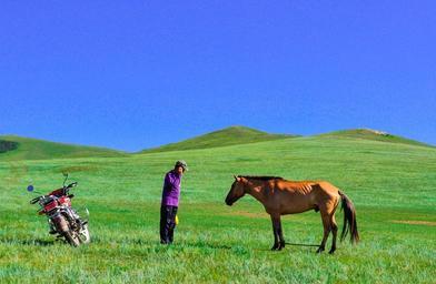 Keywords: countryside steppes nature bike horse dilemma pony ride mongolia season summer green sky clear blue travel land