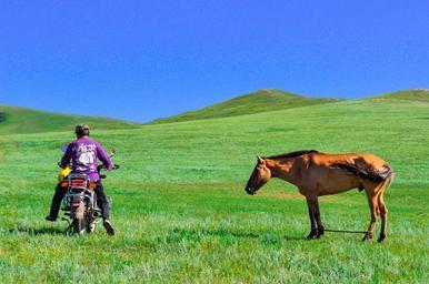 Keywords: countryside steppes nature bike horse dilemma pony ride mongolia season summer green sky clear blue travel land