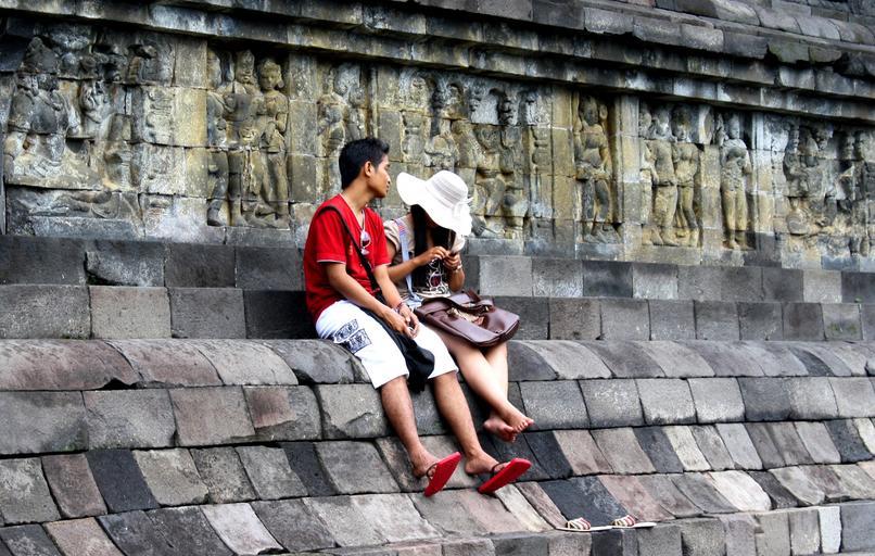 Keywords: couple boy girl sitting resting persons java indonesian budha buddhist buddhist temple temple stupa stone history world heritage architecture old buildings stone foundation heritage historical building landmark