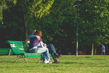 Keywords: couple kissing kiss love joy nature green bench sitting