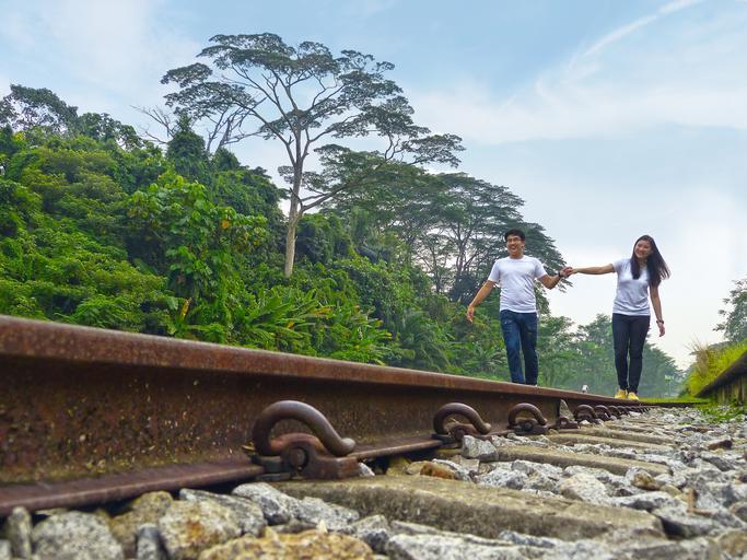 Keywords: couple young smile love nature together man woman holding railroad tracks railway tracks clouds sky trees rock green asian