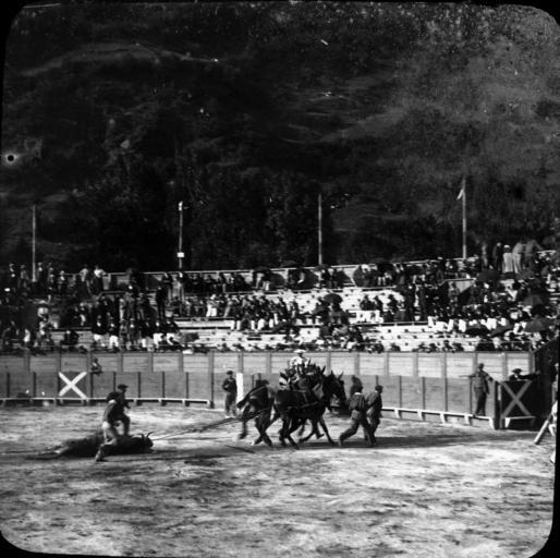 | Keywords: blackandwhite monochrome outdoor black and white Fonds Trutat - Photographie ancienne Cote : TRU C 152 Localisation : Fonds ancien Original non communicable Titre : Courses de taureaux : les mules, Luchon, 18 juin 1899 Auteur : Trutat, Eugène Rôle de l’auteur : Photographe Lieu de création : Bagnères-de-Luchon (Haute-Garonne) Date de création : : 1899 Mesures : 12 x 9 cm Mot(s)-clé(s) : -- Tauromachie -- Arènes -- Gradins -- Spectateur -- Homme -- Béret -- Mule -- Corde -- Drapeau -- Taureau -- Mort -- Bagnères-de-Luchon (Haute-Garonne) -- Soupirs, allée des (Bagnères-de-Luchon) -- Pique (France ; vallée) -- Pyrénées (France) -- 19e siècle, 4e quart Médium : Photographies -- Positifs au collodion sur plaque de verre -- Noir et blanc -- Scènes Bibliographie : Frappé (Jean-Bernard). - Autrefois Bagnères de Luchon. Tome I. - Anglet : Atlantica, 2001. - 345 p. ; 15 x 22 cm. - (Autrefois) cf. p. 246-247. Sous Original non communicable URL : numerique.bibliotheque.toulouse.fr/cgi-bin/library?c=phot... Bibliothèque de Toulouse. Domaine public Fonds Trutat - Photographie ancienne Cote : TRU C 152 Localisation : Fonds ancien Original non communicable Titre : Courses de taureaux : les mules, Luchon, 18 juin 1899 Auteur : Trutat, Eugène Rôle de l’auteur : Photographe Lieu de création : Bagnères-de-Luchon (Haute-Garonne) Date de création : : 1899 Mesures : 12 x 9 cm Mot(s)-clé(s) : -- Tauromachie -- Arènes -- Gradins -- Spectateur -- Homme -- Béret -- Mule -- Corde -- Drapeau -- Taureau -- Mort -- Bagnères-de-Luchon (Haute-Garonne) -- Soupirs, allée des (Bagnères-de-Luchon) -- Pique (France ; vallée) -- Pyrénées (France) -- 19e siècle, 4e quart Médium : Photographies -- Positifs au collodion sur plaque de verre -- Noir et blanc -- Scènes Bibliographie : Frappé (Jean-Bernard). - Autrefois Bagnères de Luchon. Tome I. - Anglet : Atlantica, 2001. - 345 p. ; 15 x 22 cm. - (Autrefois) cf. p. 246-247. Sous Original non communicable URL : numerique.bibliotheque.toulouse.fr/cgi-bin/library?c=phot... Bibliothèque de Toulouse. Domaine public |