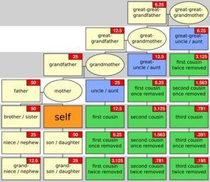 | Keywords: CousinTree kinship.svg en A chart illustrating the different types of cousins including genetic kinship marked within boxes in red which shows the actual genetic degree of relationship gene share with 'self' in percentage File CousinTree svg with kinship values from File Cousin_tree_ with_genetic_kinship png Gringer <span class signature-talk >talk</span> 2010-08-09 Without kinship values PNG version Translation possible Family trees Cousin | ||||