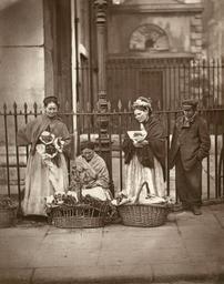| Keywords: Covent Garden Flower Women.jpg http //archives lse ac uk/Record aspx src CalmView Catalog id SR+1146 archives lse ac uk/Record aspx src CalmView Catalog i <br/>Street Life in London published in 1876-7 consists of a series of articles by the radical journalist Adolphe Smith and the photographer John Thomson The pieces are short but full of detail based on interviews with a range of men and women who eked out a precarious and marginal existence working on the streets of London including flower-sellers chimney-sweeps shoe-blacks chair-caners musicians dustmen and locksmiths The subject matter of Street Life was not new “ the second half of the 19th century saw an increasing interest in urban poverty and social conditions “ but the unique selling point of Street Life was a series of photographs ˜taken from life ™ by Thomson The authors felt at the time that the images lent authenticity to the text and their book is now regarded as a key work in the history of documentary photography http //www flickr com/photos/lselibrary/5616085547/ Covent Garden Flower Women Uploaded by Fæ 1877 John Thomson 1837-1921 PD-Old-80 Flickr-no known copyright restrictions File Upload Bot Magnus Manske May 28 2011 Covent Garden Street Life in London 1877 Sepia photographs of London Flower vendors Photos uploaded from Flickr by Fæ using a script Fruit vendors Street vendors in London Fences in London |