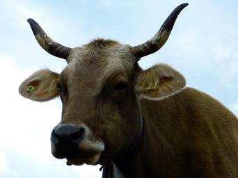 Keywords: cow beef animal milk cow horns agriculture spotted ruminant animal portrait