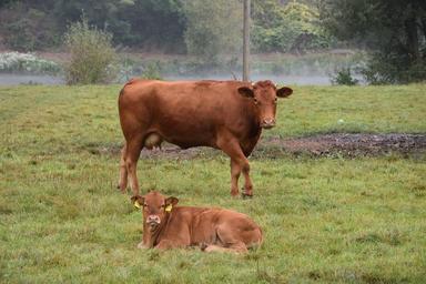 Keywords: cow calf protect beef agriculture nature pasture dairy cattle brown landscape lying stand meadow animal cattle cows