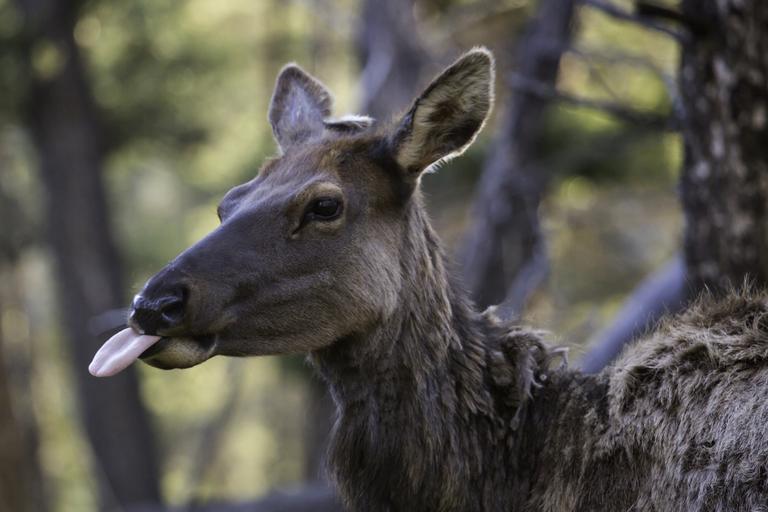 Keywords: cow elk female tongue wildlife nature outdoors wild portrait wilderness forest trees mammal game