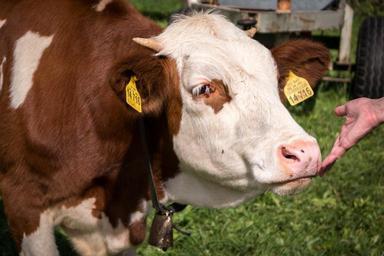 Keywords: cow hand head fur eye face dear alm pasture meadow mountains alpine portrait bavaria germany