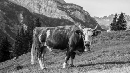 Keywords: cow meadow pasture mountains horns black and white agriculture cattle nature animal cows mountain meadows