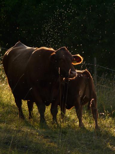 Keywords: cow pasture fly meadow animal back light umschwirren mating mosquitoes