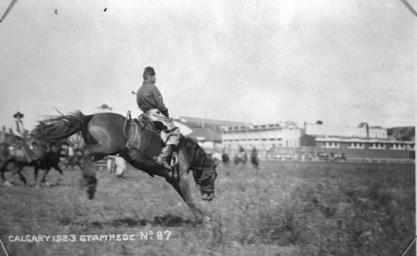 Keywords: alberta calgary calgary stampede calgarystampede stampede rodeo horse blackandwhite monochrome animal sport outdoor riding black and white 1923. A14720. 1923. A14720.