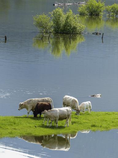 Keywords: cows calf feeding mammals large nature cattle farm country flooding water animals food chain scenery ranch animal outdoor farming ranch reflection mirroring disaster