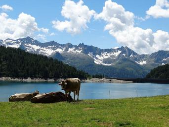 Keywords: cows cattle alm bergsee lake mountains snow mountains foresight water alpine alpine lake reservoir nature hiking mountain meadow