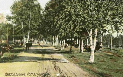 | Keywords: postcard port arthur portarthur animals cows dawson avenue dawsonavenue farm thunder bay thunderbay red river road redriverroad ontario canada history outdoor tree plant Date: 1906 Description: After the Post Office approved the mailing of illustrated postcards in 1897, many hand-coloured images of the city were produced, purchased, and mailed to friends and loved ones. Although this postcard is labeled "Dawson Avenue", it depicts a section of what is today Red River Road as seen from the top of the hill looking towards High Street. It was still a country road in those days as city buildings had not yet reached that far west. Accession No.: 973.13.312 X Date: 1906 Description: After the Post Office approved the mailing of illustrated postcards in 1897, many hand-coloured images of the city were produced, purchased, and mailed to friends and loved ones. Although this postcard is labeled "Dawson Avenue", it depicts a section of what is today Red River Road as seen from the top of the hill looking towards High Street. It was still a country road in those days as city buildings had not yet reached that far west. Accession No.: 973.13.312 X |