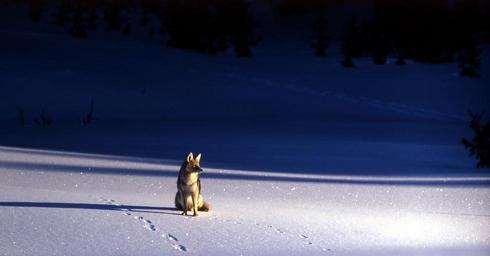 Keywords: coyote snow wildlife nature predator fur outdoors looking portrait meadow wilderness sitting shadows night