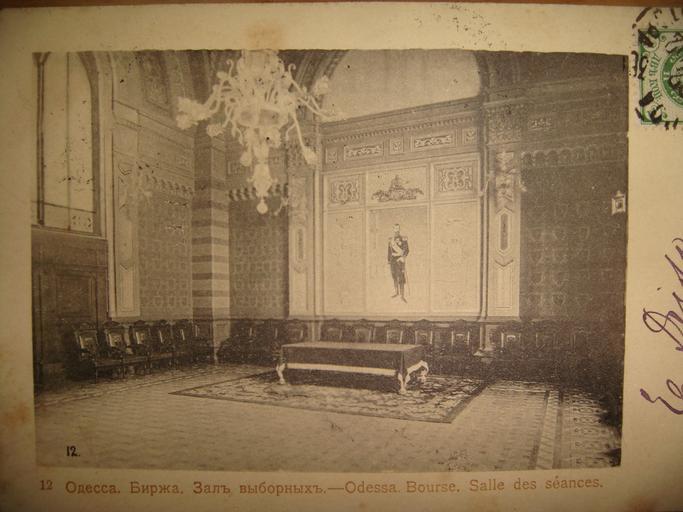 | Keywords: CP Odessa Bourse. Salle des seances.JPG en Carte Postale with interrior of Bourse Nouveau en Odessa Sale des seances of early XX century now Odessa State Filarmony ru Почтовая отк ытка с видом инте ье а овой купеческой би жи в Одессе ныне Одесская госуда ственная Фила мония own HOBOPOCC 2010-06-17 Postcards of Odessa New Bourse Odessa interiour PD-RusEmpire |