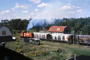 | Keywords: CPRTrainWPC.jpg CPR train pushing limestone from Beachville Limestown Quarry Beachville Ontario passing in front of Dickson's Florist Woodstock Ontario Windfield Photographic Collection POB 340 Stn B London Ontario Canada N6A 4W1 1968 C Ray User WayneRay Own PD GMD SW1200RS locomotives of the Canadian Pacific Railway Transport in Woodstock Ontario Freight trains in Ontario 1968 in Ontario 1968 in rail transport in Canada | ||||