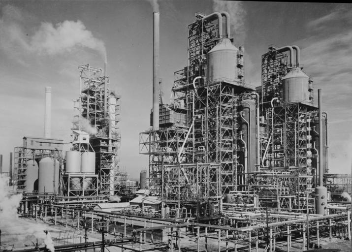 | Keywords: Cracker USA 1944.png en America's petroleum industries pour out fuel and lubricants for the United Nations These three new catalytic oil cracking units are turning out gasoline for the new machines of war at the plant of a large U S refining company in the southern U S state of Louisiana In the eight years of the development of the cracking process in producing gasoline it is estimated that 1 000 000 000 barrels of crude oil have been saved by the oil industry The cracking process subjects crude oil to heat and pressure by which the oil molecules are broken down and made to release more of their derivable elements The drain of war on such gasoline producing units as these is shown by the fact that the U S has manufactured 180 000 planes since December 7 1941 propelled by gasoline motors For example one U S Liberator four-motored bomber in a six-hour bombing run consumes 1 800 gallons of gasoline enough to last the average U S civilian motorist from three to five years LOC-image fsa 8e06335 pnp 1944 FSA PD-USGov Fluid Catalytic Cracker Louisiana in the 1940s |
