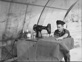 | Keywords: australian war memorial australianwarmemorial sewing blackandwhite monochrome black and white ID number: 066147 Photographer: Geoffrey McInnes Place made: Wongabel area, Queensland Date made: 5 May 1944 NX117269 Craftsman A R Bennett, motor trimmer of the 110th Brigade Workshop, Australian Electrical and Mechanical Engineers, using a heavy duty "Singer" sewing machine to stitch canvas bags. Rights information: No known copyright restrictions. This photograph is from the Australian War Memorial's collection www.awm.gov.au Persistent URL: cas.awm.gov.au/item/066147 ID number: 066147 Photographer: Geoffrey McInnes Place made: Wongabel area, Queensland Date made: 5 May 1944 NX117269 Craftsman A R Bennett, motor trimmer of the 110th Brigade Workshop, Australian Electrical and Mechanical Engineers, using a heavy duty "Singer" sewing machine to stitch canvas bags. Rights information: No known copyright restrictions. This photograph is from the Australian War Memorial's collection www.awm.gov.au Persistent URL: cas.awm.gov.au/item/066147 |