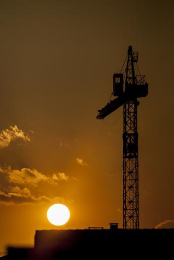 Keywords: crane construction load work sun industrial prevention manufactures heavy load caution sunset backlight sky afternoon contrast