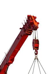 Keywords: crane site work machine cutout red lifting cables pulleys arm isolated form