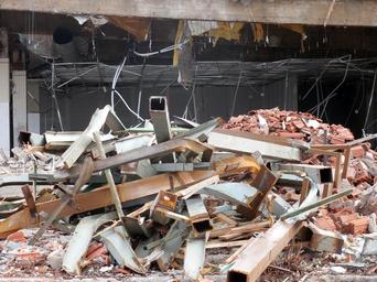 Keywords: crash demolition construction work site ruin destroyed building rubble destruction demolished tear off decommissioning new beginning house demolition debris collapse