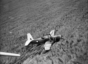 | Keywords: Crashed Vengeance bomber of 24 Sqn RAAF 1944.jpg A crashed Vultee Vengeance dive bomber aircraft of No 24 Squadron RAAF following an attack on the Japanese-held airstrip at Alexishafen on 27 February 1944 <br> Original caption New Guinea 1944-02-27 Following an air raid by Vultee Vengeance dive bomber aircraft of No 24 Squadron RAAF on the Japanese-held airstrip at Alexishafen on the north coast of New Guinea Flying Officer K H Pike Adelaide SA stands on the wing of his aircraft with an Aldis lamp and flashes a message to the rescue plane after a forced landing in wild kunai grass country Flight Sergeant K Morgan Drummoyne NSW stands by They were later picked up and flown to safety OG0658 1944-02-27 John Thomas Harrison Australian armed forces Image copyright Copyright expired - public domain frame cropped PD-Australia Vultee Vengeance RAAF No 24 Squadron RAAF New Guinea campaign John Thomas Harrison |