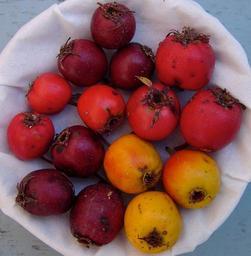Keywords: Crataegus punctata fruits.jpg en Fruit from several trees of this species growing at the same site in Toronto Canada own Nadiatalent 2004-10-06 Crataegus punctata Ashbridge's Bay trees