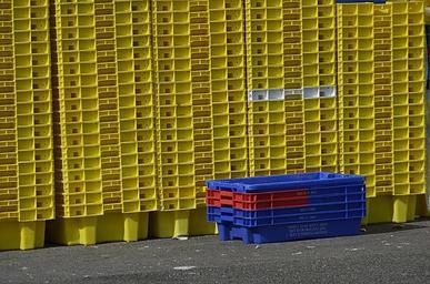 Keywords: crates plastic blue yellow auction stacking wharf colors factory