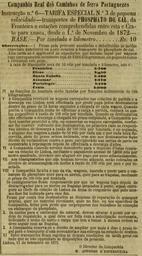 | Keywords: CRCFP calcium oxide phosphate freight rate advertisement.jpg pt Anúncio da Companhia Real dos Caminhos de Ferro Portugueses mostrando a Tarifa Especial n º 3 para transporte de fosfato de cal entre o Crato e a fronteira com Espanha Esta imagem foi publicada no Diario Illustrado n º 127 de 4 de Novembro de 1872 e digitalizada pela Biblioteca Nacional de Portugal en Advertisement of the Companhia Real dos Caminhos de Ferro Portugueses Royal Company of the Portuguese Railways showing the special fare n º 3 for the transport of calcium oxide phosphate between Crato and the spanish border This image was published on the Diario Illustrado newspaper No 127 of 4th November 1872 and scanned by the Biblioteca Nacional de Portugal 1872-09-21 http //purl pt/14328/1/j-1244-g_1872-11-04/j-1244-g_1872-11-04_item2/j-1244-g_1872-11-04_PDF/j-1244-g_1872-11-04_PDF_24-C-R0150/j-1244-g_1872-11-04_0000_1-4_t24-C-R0150 pdf Companhia Real dos Caminhos de Ferro Portugueses Institution Institution Biblioteca Nacional de Portugal Custom license marker 2015 08 12 Anonymous-EU Uploaded with UploadWizard Public transport information in Portugal Companhia Real dos Caminhos de Ferro Portugueses 1872 in rail transport in Portugal Linha do Leste Images from the Biblioteca Nacional de Portugal |