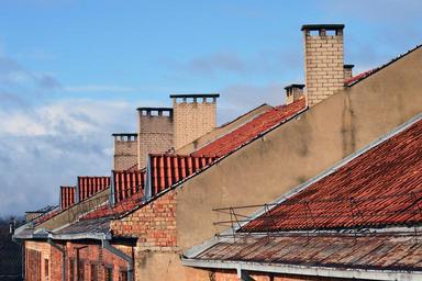 Keywords: cream color brick chimney red tile roof kaunas lithuania europe baltic european architecture exterior stack blue sky old town old town city