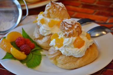 Keywords: cream puff pastries bake baked goods delicious choux pastry sweet feasting tangerines eat dessert cake food sweet dish sugar egg butter small cakes brand coffee time sweetness