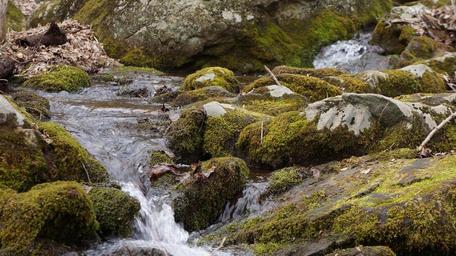 Keywords: creek river flow water stones pebbles moss cascade tranquil nature scenery rocks