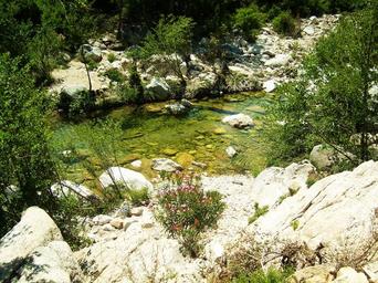 Keywords: creek transparent water green vegetation rock italy sardinia laurier rose reflection in the water