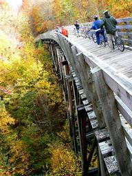 Keywords: Creepertrail2.jpg en Riders on the Virginia Creeper Trail stop at one of the high trestles Own Metayel 2007-10 Virginia Creeper Trail Mountain biking Bridges in Virginia